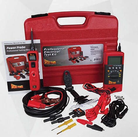 Dette profesjonelle testsettet inneholder Power Probe III kombinert med Power Probe multimeter, CAT-IV 6/JOV Hybrid Safe Digital multimåler. Det medfølger 2 stk. 3 meter målekabler, 2 stk.alligatorklemmer, ekstra 10 Amp sikringer og 600 milliampere sikringer, probe adaptere, og instruksjonshåndbok. Alt i en praktisk koffert.