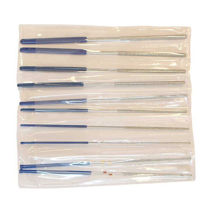 Leveres i plastetui med 12 stk. diamantbelagte rensenåler 0,76 - 3,04mm.