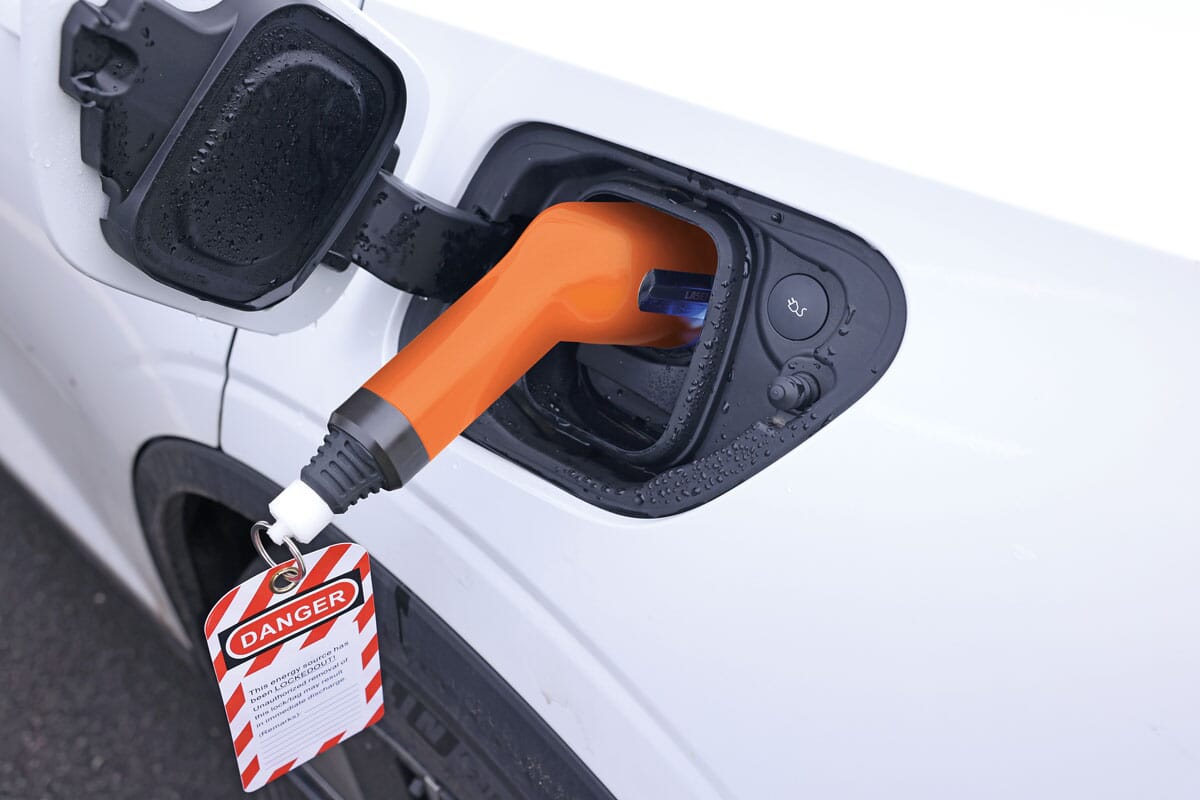Enheten låser effektivt drivlinjen ved å benytte elbilens ladeprotokoll, som forhindrer kjøring så lenge ladekabelen er plugget inn. Produsert i slitesterk polykarbonat med kontakter i kobberlegering. Leveres i signaloransje farge med advarselsskilt.