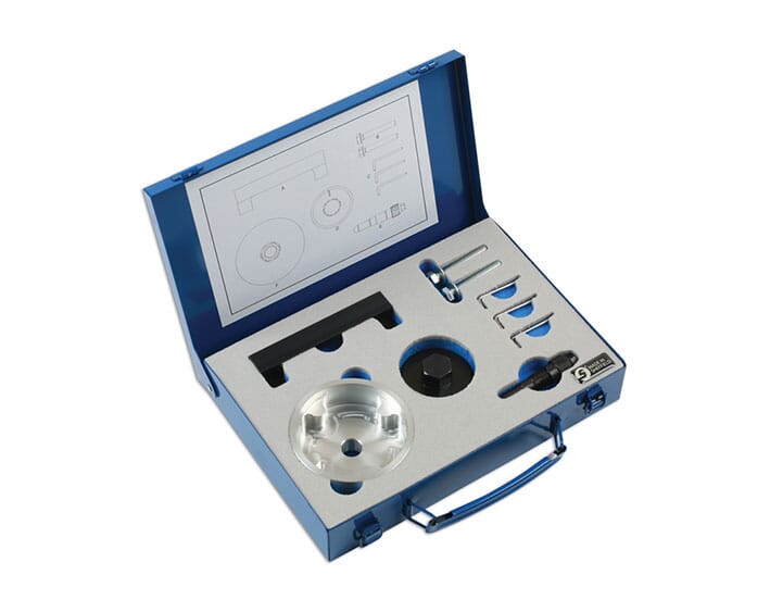 Settet inneholder de nødvendige komponentene for å låse motoren i riktig posisjon slik at registerkjedet kan skiftes eller