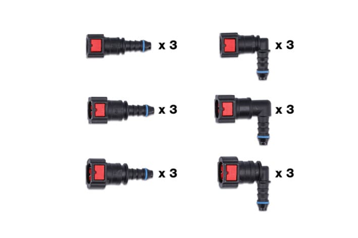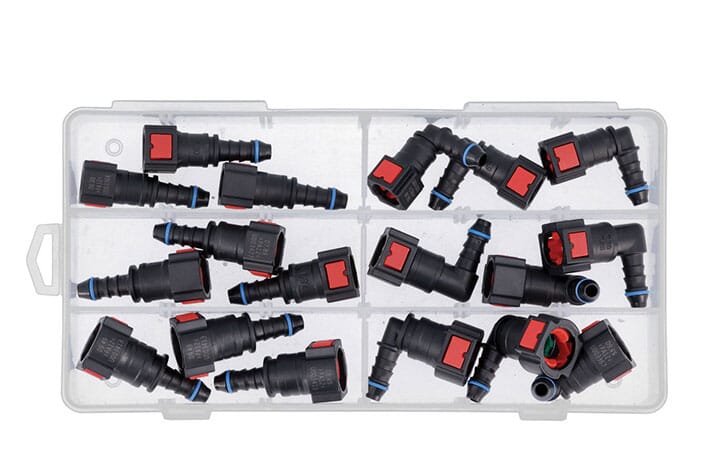 Et sett med 6 forskjellige størrelser, rette og 90° AdBlue® hurtigkoblinger for drivstoffledning som muliggjør tette koblinger på innvendige diametere på drivstoffslangen på 6 mm. 90° (albue) vinkelen gir enklere feste på trange steder. Hurtigkoblinger er designet for bilindustrien for overføring av drivstoff, olje, vannkjølesystemer og luft. Den selvlåsende kontakten gjør at den enkelt og raskt kan kobles til og fra, med det brede driftstemperaturområdet sikrer den at den kan takle de ekstreme temperaturene som kan føre til sprekker og lekkasjer. For å lette monteringen av drivstoffrøret i hardplast til koblingene, bruk laserverktøy for innføringsverktøy for rørkoblinger, delnr. 6933.