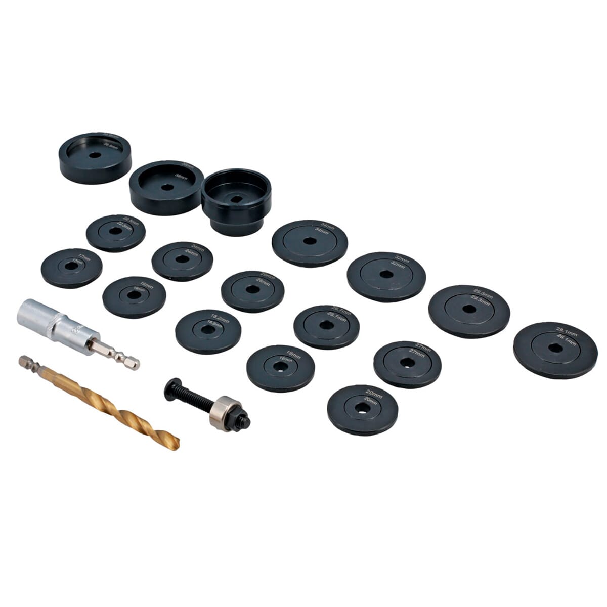 Hullstansestørrelser: 17, 18, 18,2, 19, 20, 22,5, 24, 26, 26,7, 27, 28,1, 29,3, 32, 34, 38 og 38,9 mm.