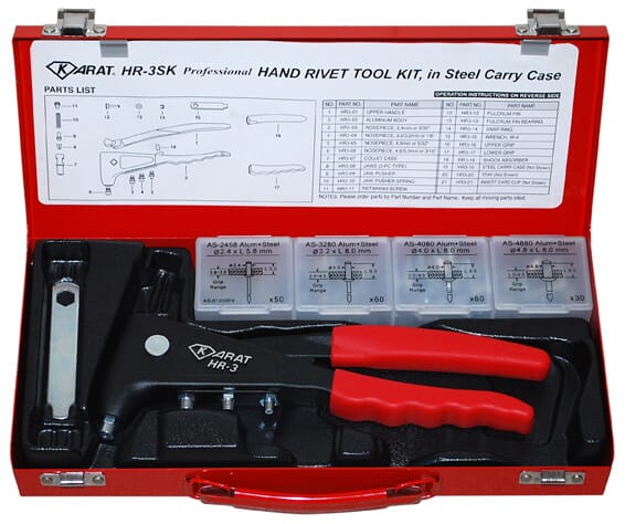 Settet inneholder industritangen HR-3 for blindnagler 2,4 - 3,2 - 4,0 - 4,8mm.