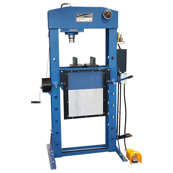 En profesjonell lufthydraulisk verkstedpresse fullspekket med utstyr. Leveres komplett med: