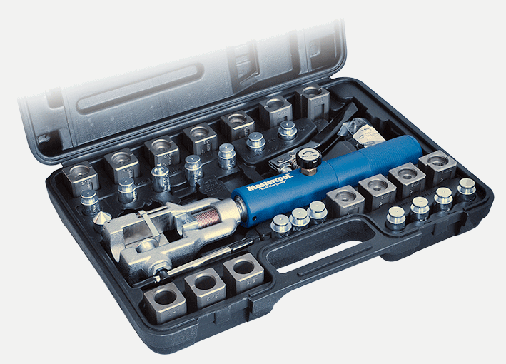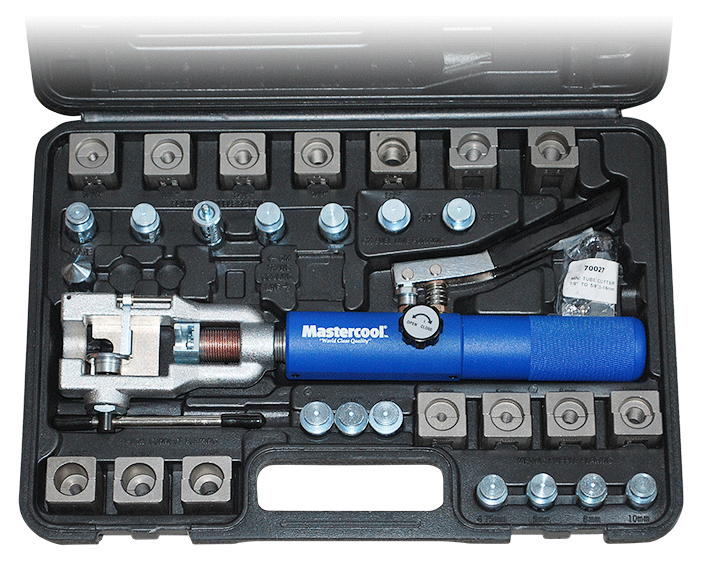 Meget profesjonelt flenseverktøy med hydraulisk håndpumpe som gjør at man kan arbeide direkte på bilen.