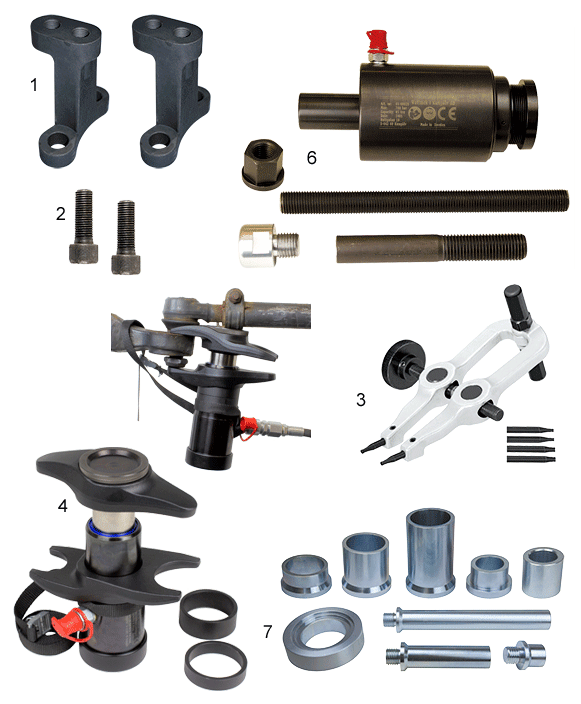 I settet inngår verktøy for hurtig bytte av koniske og rette spindeltapper, fjærforinger (32T) samt grove låseringer. Demonteringsverktøy for styreledd, hjulnav samt bremse-hevarmer.