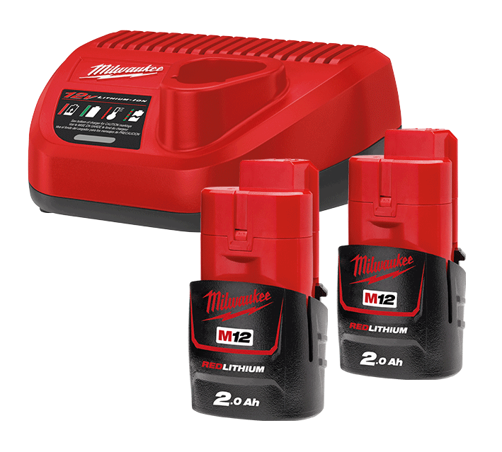 M12 2,0 Ah REDLITHIUM™ batterisett: 2 x M12 2,0 Ah REDLITHIUM™ batterier og en C12C lader (40 min).