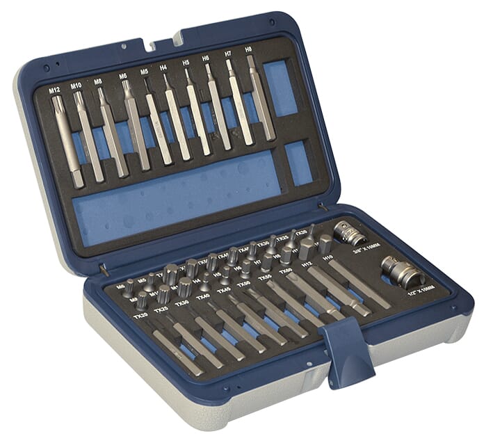 Bits 3/8" x 30mm og 70mmUnbrako.: 4-5-6-7-8-10-12mmTorx: 20-25-30-40-45-50-55-60Spline / XZN: M5-6-8-10-12Bitsholder: 3/8" og 1/2" for 10mm bits