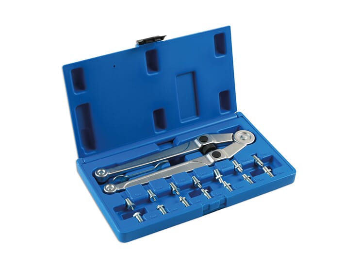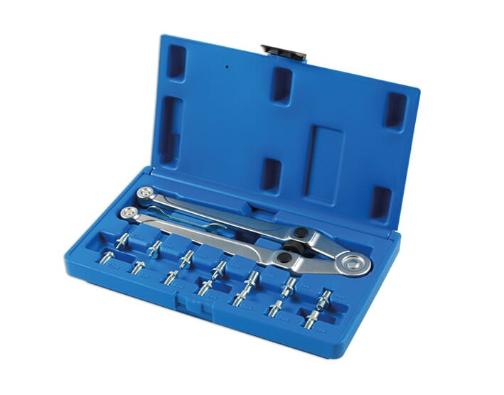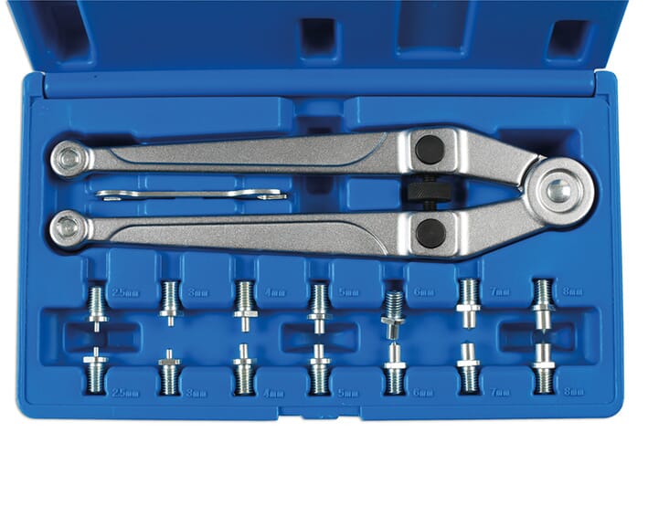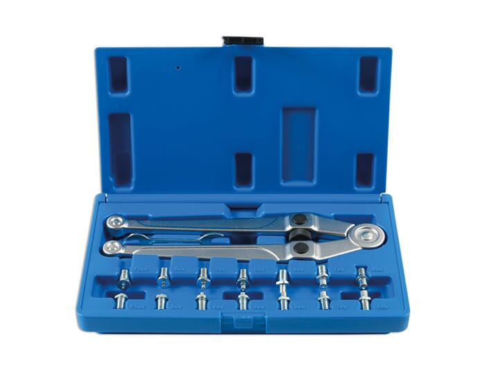 Inneholder justerbar nøkkel med kapasitet 20-100mm, samt løse tapper