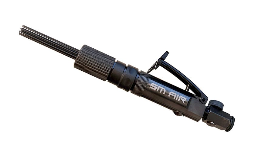 En genial liten rustbanker på bare 230mm som virkelig slår over sin egen vektklasse! Den har 13 nåler som hammrer og banker mer enn både Karius og Baktus. På grunn av størrelsen kommer den til nesten over alt, om du skal rengjøre bremseklaven, kaliperen eller rundt og inni trange plasser. Nålebankeren slår hele 3000 slag pr min og etterlater seg en ren og uskadet overflate. Med den justerbare ventilen kan du justere effekten mellom 0 og 100% effekt.